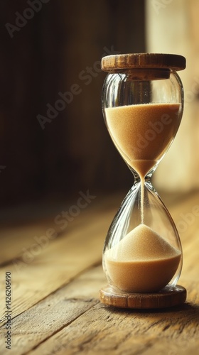 Elegant hourglass with beige sand on rustic wooden surface near window, symbolizing time passing, patience, and timelessness in natural warm lighting setting