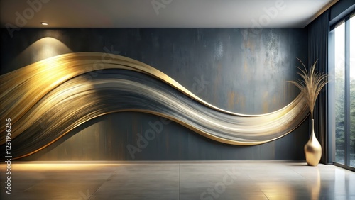 Elegant Interior Design Featuring a Curving Gold and Gray Wall Accent, Modern Floor, and a Sleek Vase