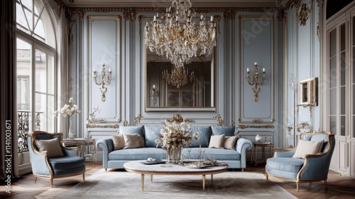 Elegant interior design of a luxurious living room with chandelier