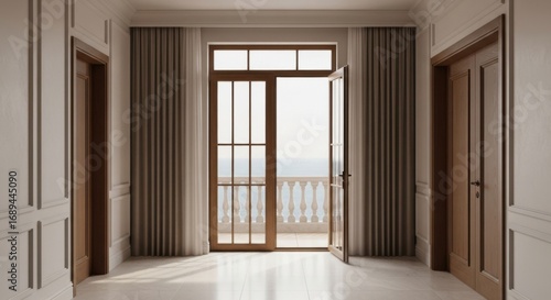 Elegant Interior Room with Large Glass Doors Opening to Balcony and Ocean View in Bright Modern Home
