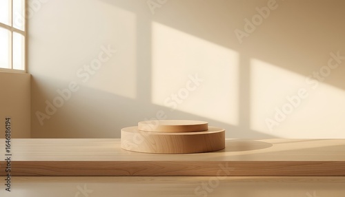 Elegant interior scene displaying a wooden pedestal platform for presenting luxury products against a plain wall and light from a window