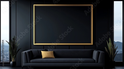 Elegant Interior with Dark Sofa, Gold Frame Artwork, Minimalist Design, and Scenic Window Views.