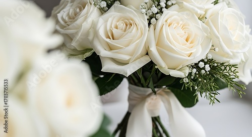 Elegant ivory roses bouquet, tied with silk ribbon, soft natural light
