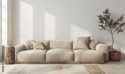 Elegant Japandi Living Room: Cozy Beige Sofa in Modern Minimalist Apartment. Fusion of Scandinavian and Japanese Design Aesthetics. Serene and Sophisticated Interior with Clean Lines and Neutral Palet