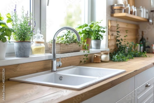 Elegant Kitchen Design: White Furniture, Wooden Counter, Sink by Window, Stylish Modern Touches in New Apartment Interior