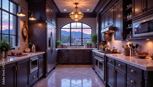 Elegant kitchen revealing opulence at twilight, luxury interior design