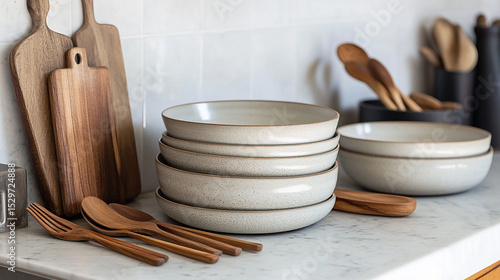 Elegant Kitchenware: A beautifully arranged collection of kitchen essentials, featuring pristine plates, cutting boards, and wooden utensils, ready to inspire culinary creativity in any home.