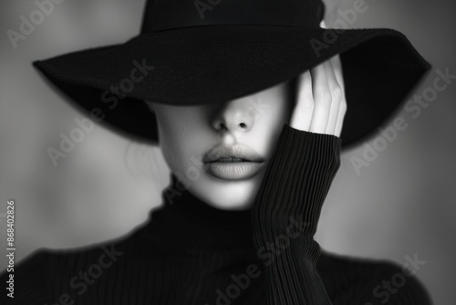 Elegant lady in wide brimmed hat on grey background. Black and white portrait of young and beautiful woman. Retro fashion, monochrome noir concept. Banner with copy space