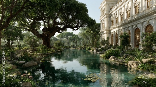Elegant Large Tree Overlooking Calm Waterway Surrounded by Lush Garden and Historic White Building