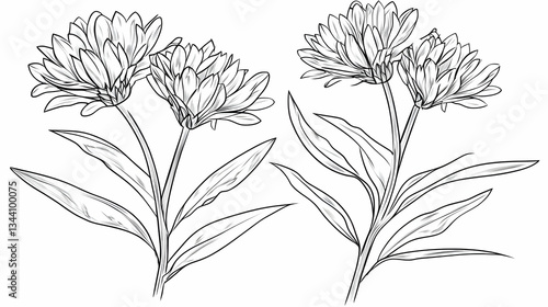 Elegant line art drawing of two blooming daisies, isolated on white background, perfect for botanical illustrations, greeting cards, or website design