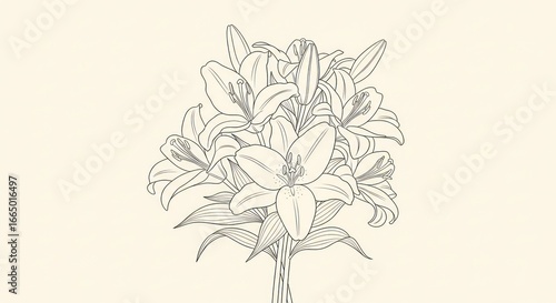 Elegant Line Art Illustration of a Lush Bouquet of White Lilies on a Soft Yellow Background.