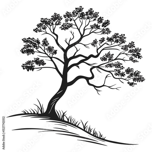 Elegant line art of a solitary tree on a gentle hillside with intricate branches and lush leaves