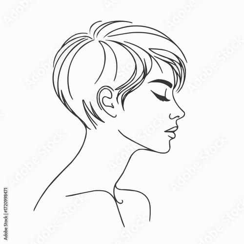 Elegant line drawing of a woman's profile with a short hairstyle, representing modern beauty and confidence.