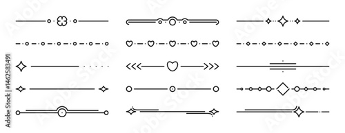 Elegant linear black borders and frames set. Aesthetic design elements for posters, banners, backgrounds, projects, etc. Ornament with hearts and sparkles. Vector illustration, editable stroke.