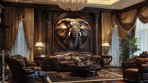 Elegant Living Room Poster: Opulent Space with Grand Elephant Sculpture, Dark Wood Furniture, and Soft Lighting - Perfect for Luxurious Home Decor or Stylish Interior Design Inspiration