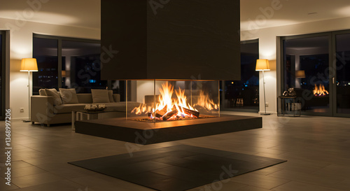 Elegant living room showcasing a modern floating wood-burning fireplace design