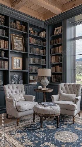 Elegant Living Room with Classic Design and Cozy Book Nook