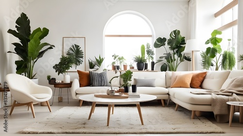 Elegant living room with comfy carpet, mid-century furniture, white walls, white walls, and houseplants is a hallmark of modern Scandinavian interior design.