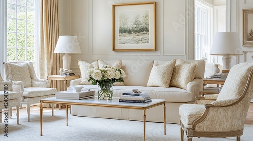 Elegant Living Room with Cream Furniture Gold Accents and Artwork Display