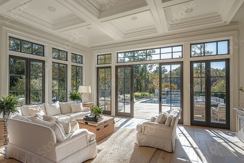 Elegant living room with French doors, coffered ceiling, white walls, light wood flooring, and classic home decor style
