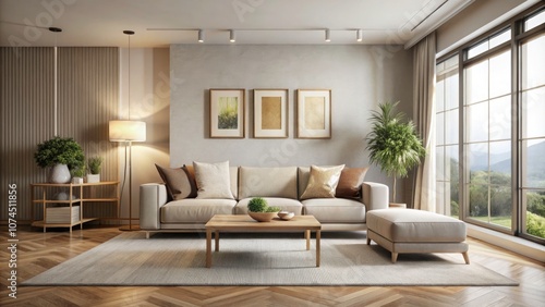 Elegant Living Room with Spacious Sofa and Minimalistic Decor for Personalized Artwork Display
