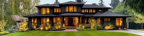 Elegant luxury home with beautifully landscaped gardens and warm exterior lighting at dusk : Generative AI