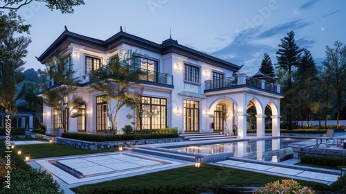 Elegant luxury mansion with modern architecture, featuring a stunning exterior and illuminated gardens at dusk.