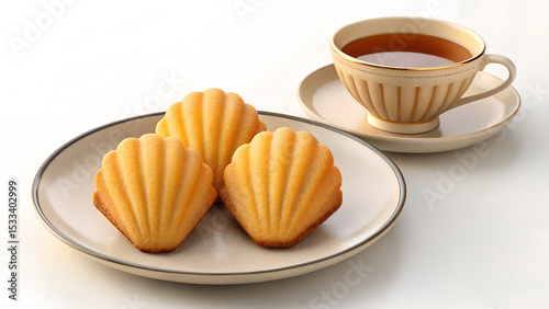 Elegant Madeleine Cookies with Tea Cup on White Background Minimalist Style