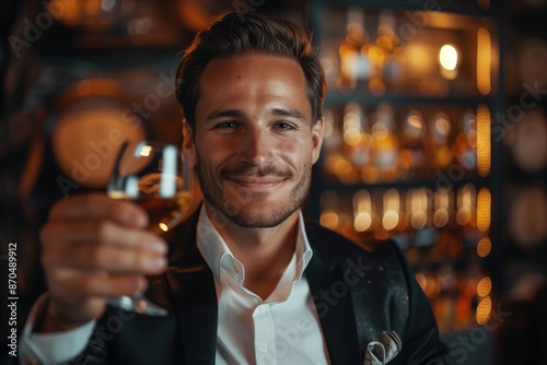 Elegant man in suit enjoying fine whiskey in luxurious bar. Celebrating achievements, sophisticated lifestyle, nightlife, luxury experience, premium spirits.