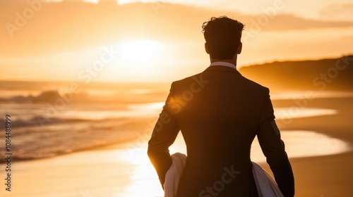Elegant Man in Suit Watching Serene Beach Sunset: A Moment of Reflection and Calm