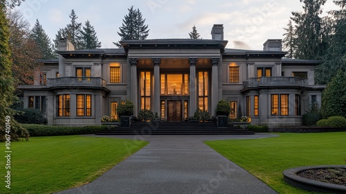 Elegant mansion with large windows and a manicured lawn, illuminated at dusk.