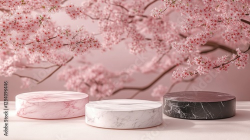 Elegant marble display platforms with cherry blossoms in serene pink setting