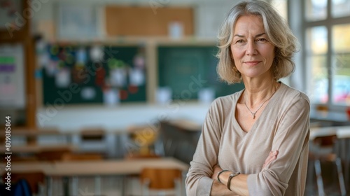 Elegant mature teacher standing confidently in colorful classroom, reminiscent of lifelong learning and education celebration, perfect for back-to-school themes.