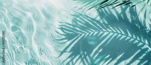 Elegant minimalist background concept featuring close-up water surface with gentle ripples and subtle blurred palm leaf shadows on the beach, evoking a peaceful, natural and pure atmosphere.