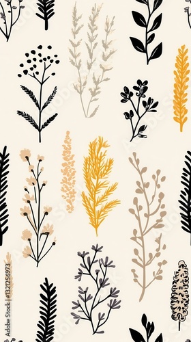 Elegant minimalist black and white floral pattern featuring various plants in a contemporary design aesthetic
