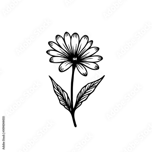 Elegant minimalist botanical drawing of a daisy flower with stem and leaves