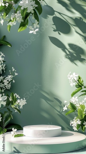 Elegant Minimalist Display with White Flowers and Soft Green Background