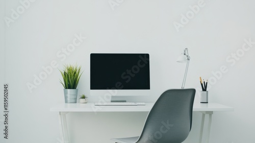 Elegant minimalist home office setup with minimal decor. Featuring a clean, open design with contemporary lines