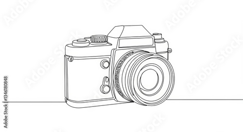 Elegant minimalist line drawing of a vintage camera with lens detail