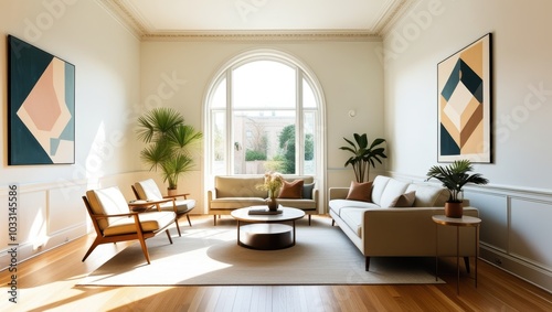 Elegant minimalist living room, mid-century modern sofa, abstract geometric artwork, large arched windows, natural light, hardwood floors, potted palm plant, round coffee table, bright white walls, hi