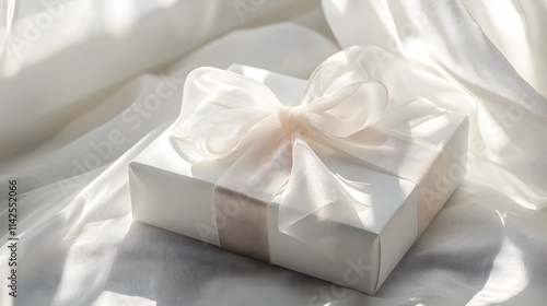 Elegant Minimalist White Gift Box with Sheer Ribbon on Soft Fabric