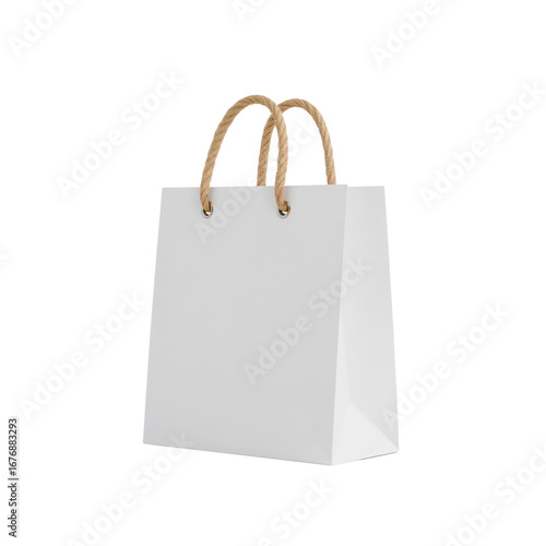 Elegant minimalist white paper shopping bag with woven handles stands alone in simplicity