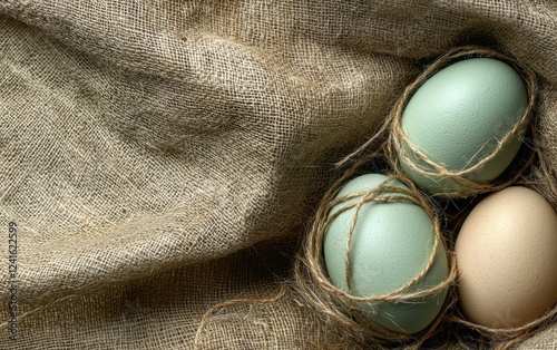 Elegant mockup background with space for text featuring Easter eggs wrapped in twine and natural textures for a sustainable and eco-friendly aesthetic for Easter
