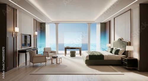 Elegant Modern Bedroom Design with Ocean View and Minimalist Aesthetic, Featuring Comfortable Furniture and Natural Light Streaming Through Windows