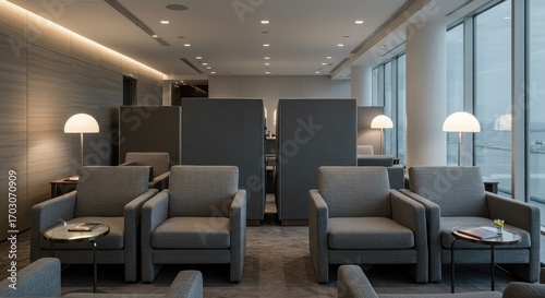 Elegant modern lounge with comfortable seating and ambient lighting, perfect for luxury travel, business waiting areas, or sophisticated hospitality spaces.