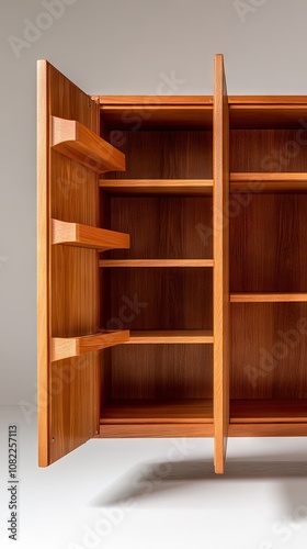 Elegant modern solid wood cabinet with sliding doors and shelves showcased in natural light