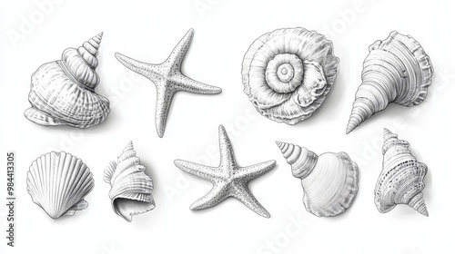 Elegant Monochrome Seashells and Starfish Illustration for Beach-themed Designs and Nature Decor with Copy Space