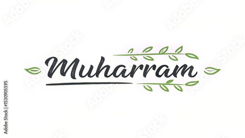Elegant Muharram Calligraphy with Delicate Green Leaf Accents on a Clean White Background.