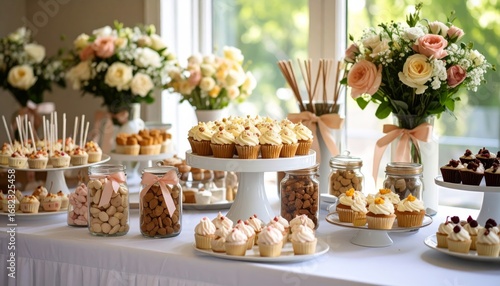Elegant multi-tiered wedding cake decorated with fresh flowers sits on a table
