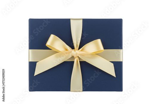 Elegant navy blue gift box with golden ribbon isolated, present for special occasion and celebration in PNG format